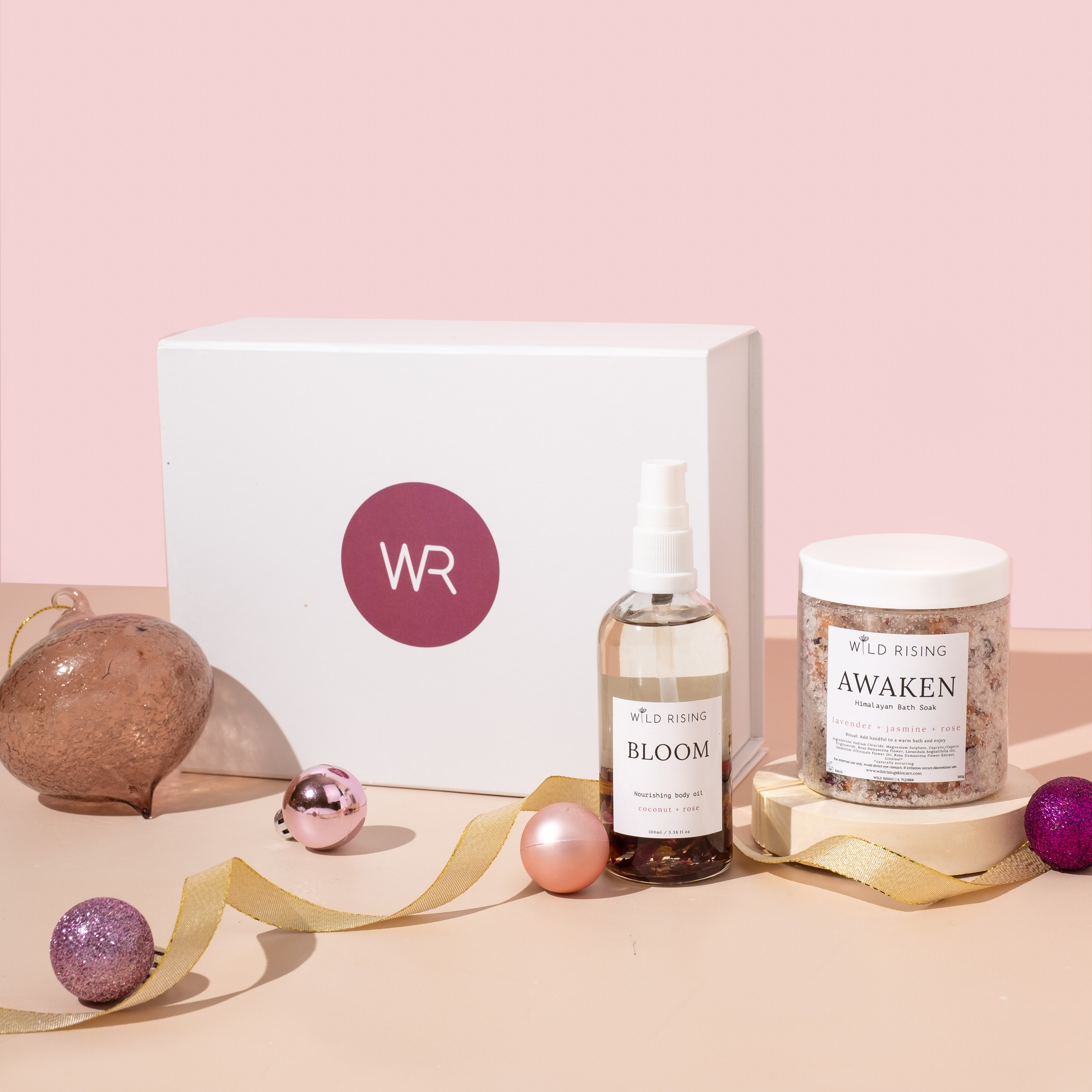 Our Christmas beauty and skincare gifts are packaged in our branded white magnetic gift boxes. Inside you'll find the products beautifully wrapped with tissue paper and pink shredded paper.